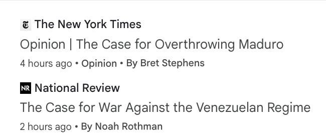 I was going through the news am hour ago when I came across this. It was a side-by-side snap shot, of 2 different corporate media organizations, with headlines that were obviously geared towards normalizing an invasion of Venezulea