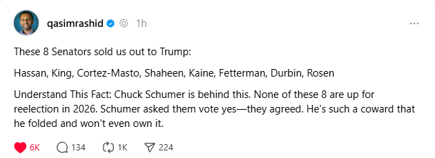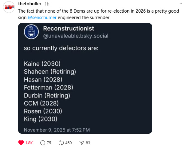Quite a few have already pointed to the fact that the 8 Senators who voted for this, conveniently do not have primaries in 2026…almost like this was orchestrated.
