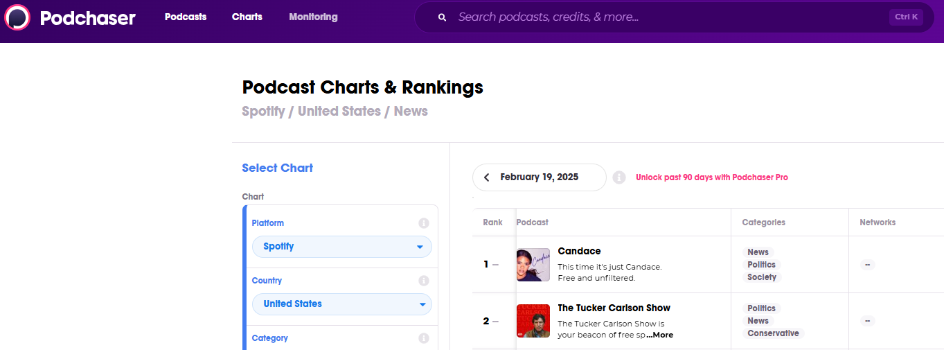 Podcasts are incredibly popular in America & a lot of people consume their news that way. As of today, the top two podcasts in the politics genre on Spotify are Candace Owens & Tucker Carlson.