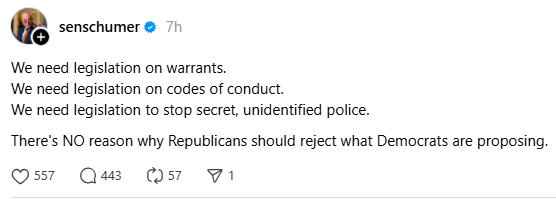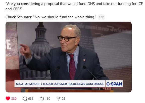 First and foremost, I almost decided to have today’s post focus on the fact that Senate Minority Leader Chuck Schumer said earlier today, that if Republicans “meet our demands”, he was fine with funding ICE again.
