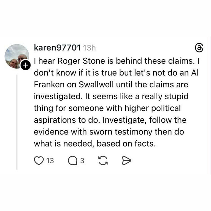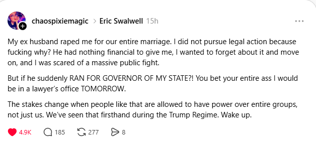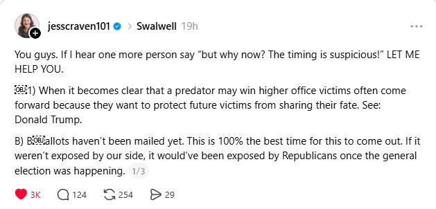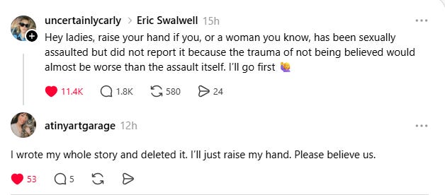 After seeing the reactions of so many online this weekend, I already know that some will see this post & immediately unsubscribe from my newsletter. My reaction to this - I don't care. I 100% stand by my words in this post. If you're more concerned with protecting the reputation of Eric Swalwell, more than the victims who bravely came forward, don't let the door hit you on the way out.