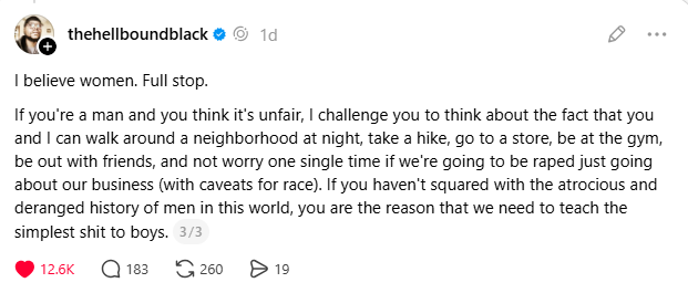 I would’ve assumed that after the hearings around Brett Kavanaugh, the allegations against Donald Trump, and the countless claims across the Epstein Files, that we wouldn’t have to say this anymore…