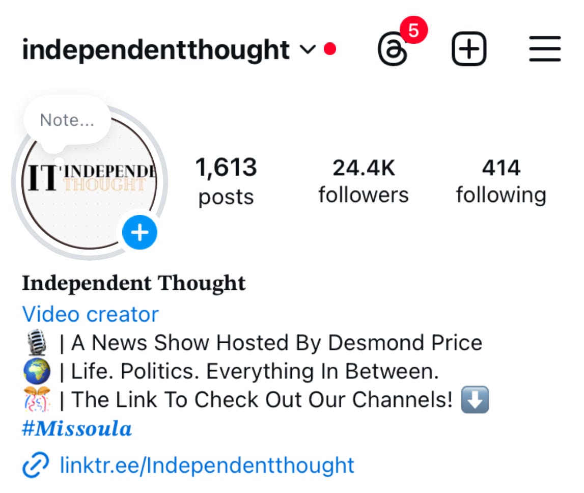 Originally, Independent Thought was never going to be anything more than I podcast. A podcast that was supposed to be shared between myself and a friend from high school. He and I spent years talking about politics casually. Whether it was at the bar (obviously the best place to have these discussions), at one of our homes, or over the phone after he moved away from Missoula.