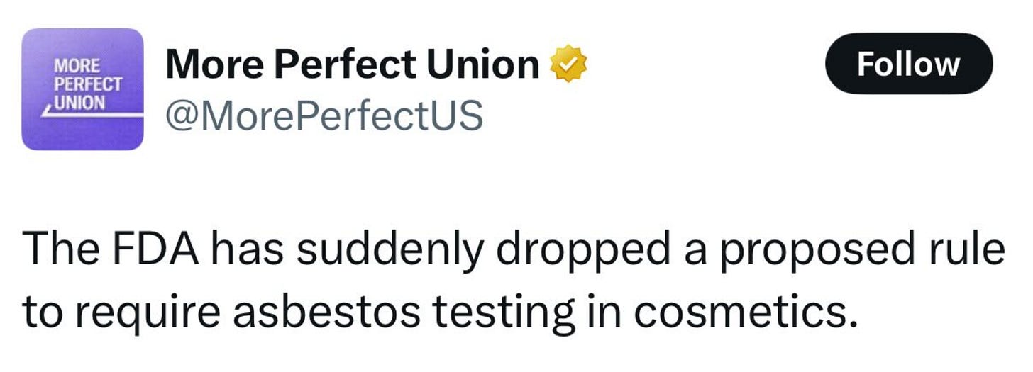 More Perfect Union reported that the FDA has suddenly dropped a proposed rule that would have required asbestos testing in cosmetics.