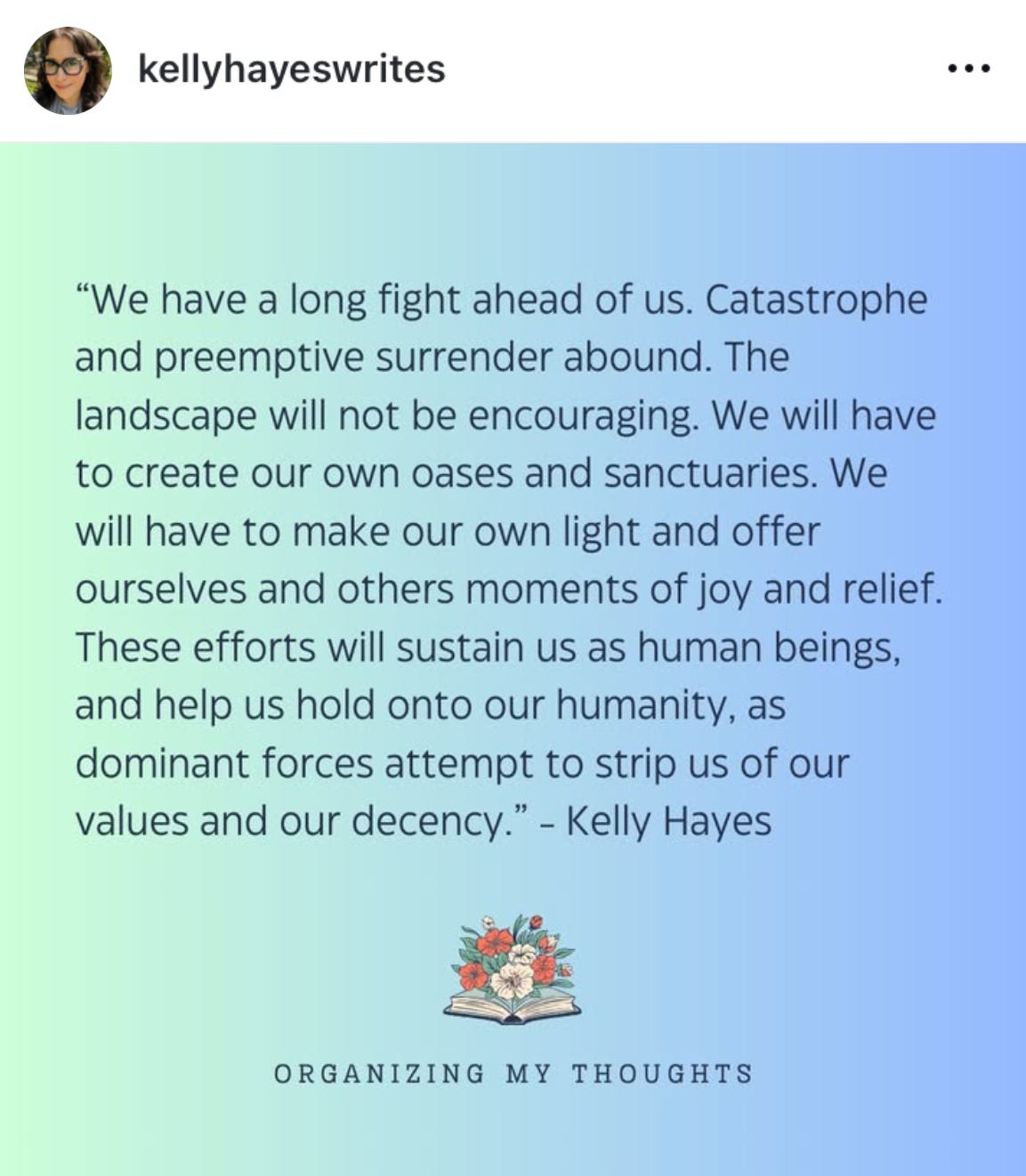 The next few years aren’t going to be easy. I’m not going to turn on the toxic positivity and say something like “if we all stick together, we’ll make it!” because the truth is, the more empowered racists, homophobes, transphobes, and misogynists feel, the higher the risk is for those of us on the receiving end of their lies, policies, and actions. But I do wholly believe that taking care of ourselves and coming together in community is an essential foundation for survival.