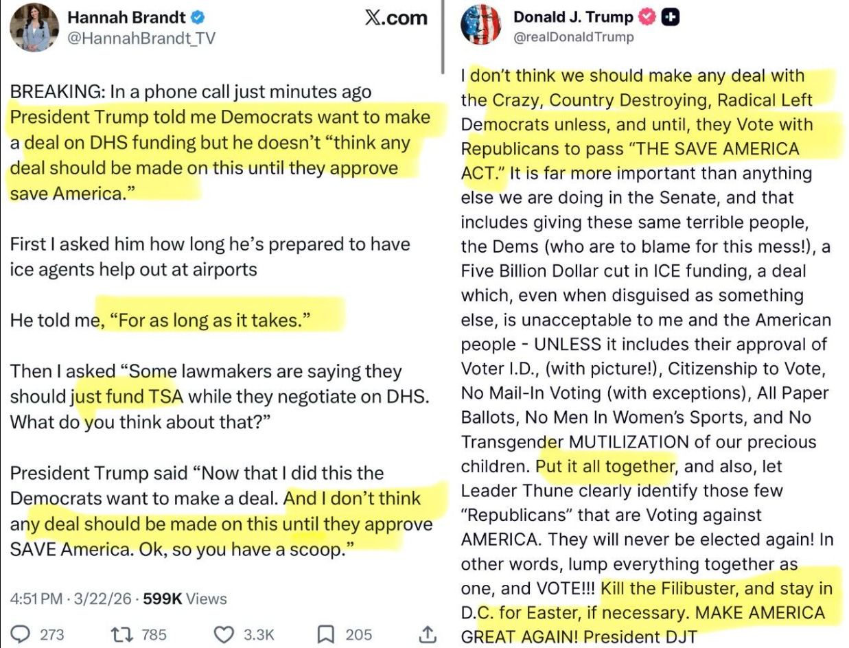Meanwhile, Democrats point out that they have offered several funding bills that would fund TSA, but leave out funding for ICE. Something MAGA has been against at this point.