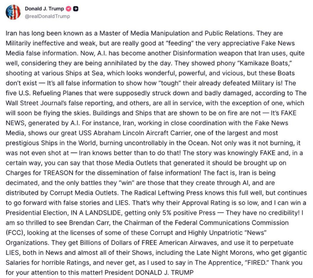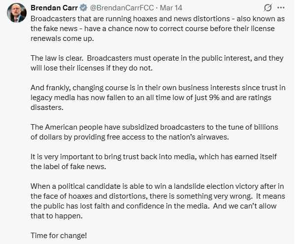 FCC Chair Brendan Carr took to X earlier, to echo Trump’s comments, which effectively is letting news outlets know - cover the news how we say, or we might take you off the air.