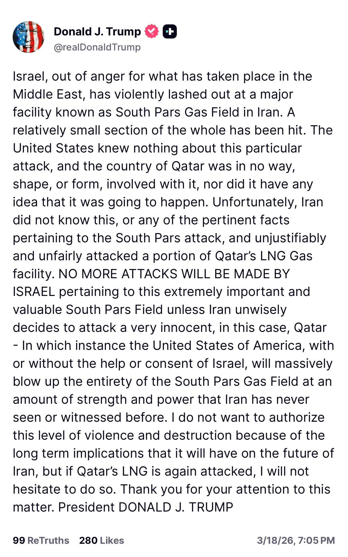 After the strike on the field, Iran retaliated by striking an LNG (liquefied natural gas) plant in Qatar, which wiped out 17% of their total capacity, which the CEO said today may take 5 years to fully repair.