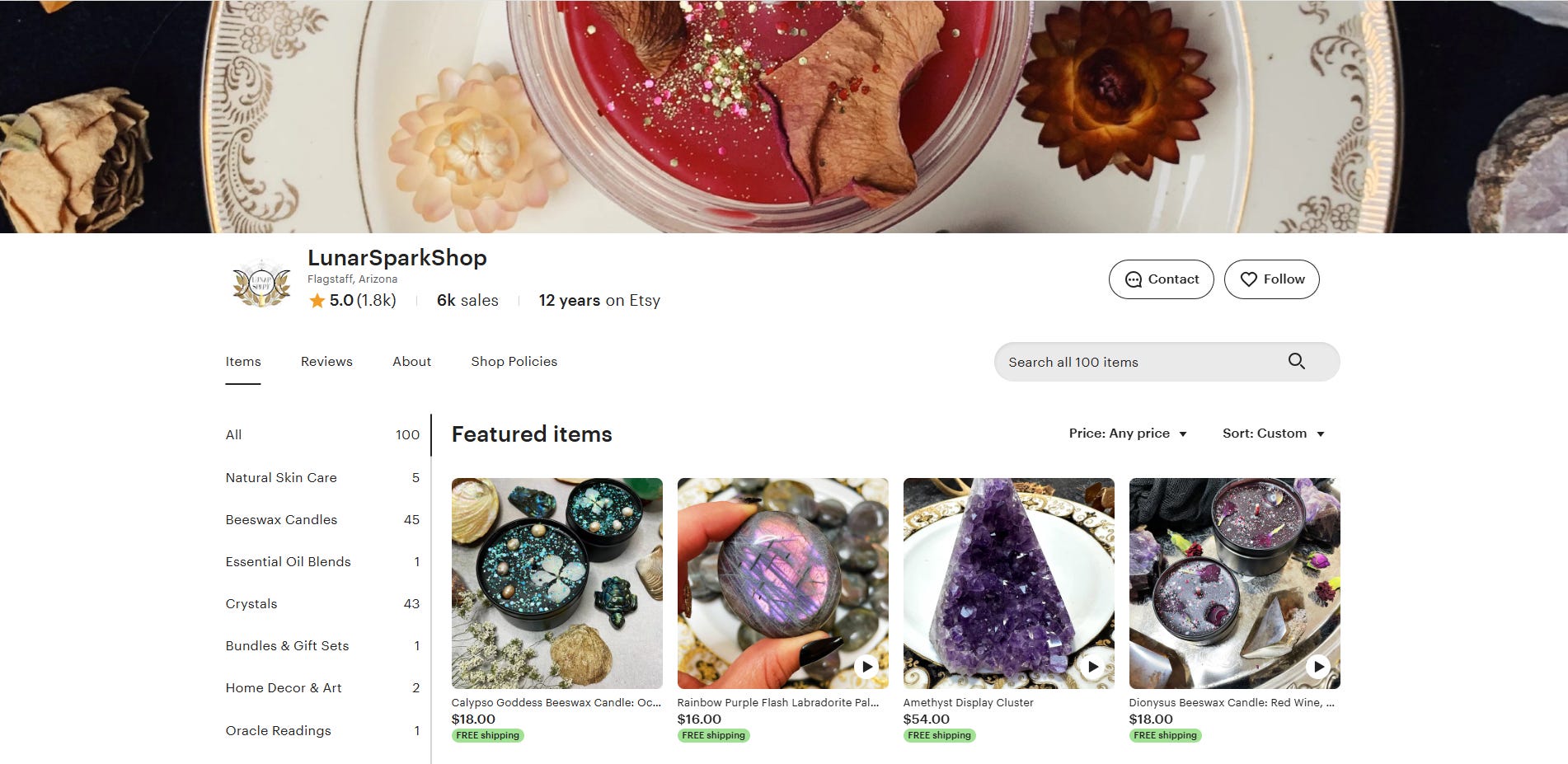 Each is made with intention and the aromas are a delight to the senses. You can also find ethically curated crystals in her shop, natural skin care items, and magical decor.